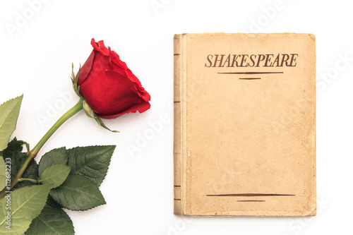 © Jasmin, Naklejka premium An old book by Shakespeare and a red rose sit on a white background