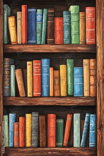 Fototapeta premium An old bookshelf filled with colorful books, perfect for clip art or background in educational projects.