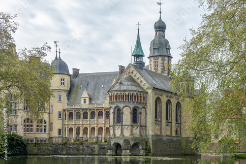 © mikevanschoonderwalt, Fototapeta premium An old castle hundreds of years old by a lake. The building reflects in the water and is surrounded by trees.