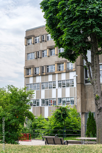 © Richard Nantais, Fototapeta premium An old concrete school on a grey sky