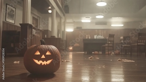 © wudu_8, Fototapeta premium An old crumbling cathedral with pumpkins glowing from the broken windows