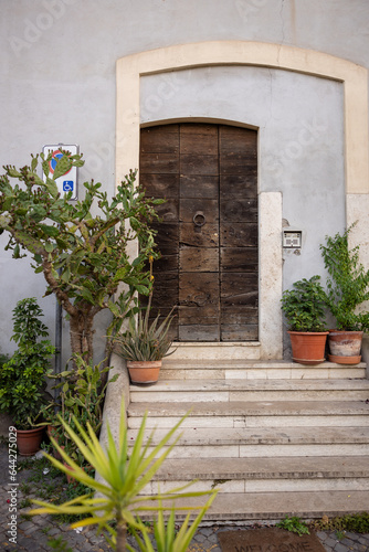 Naklejka premium An old European dark wood door entry way with steps, plants and a classic old...