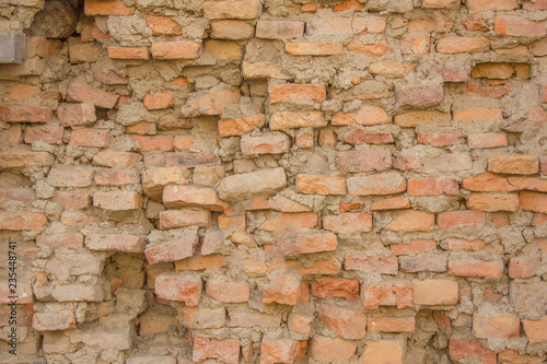 © Pavel, Obraz premium an old heavily destroyed red brick wall. rough surface texture