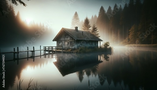 Fototapeta premium An old, isolated wooden cabin surrounded by early morning fog, with a small dock extending into a serene lake.