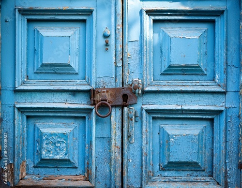 © Karen, Naklejka premium an old locked door painted in blue peeling paint front view background photo