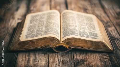 © Esti, Obraz premium An old open book displaying its aged paper and printed text, resting on wooden planks