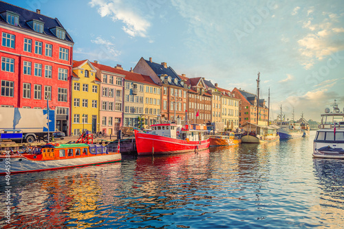 © Chernobrovin, Obraz premium An old red and white fishing boat stands among other ships and yachts near the old small multi-colored houses in the Nyhavn canal. Copenhagen, Denmark