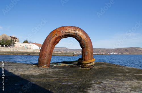 Fototapeta premium An old rusty metal device for mooring a boat on a sea pier.