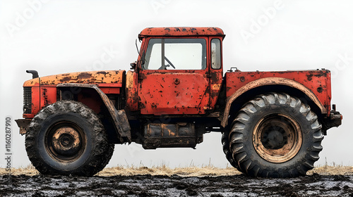 Fototapeta premium An old, rusty red tractor parked on a muddy field, showcasing its vintage...