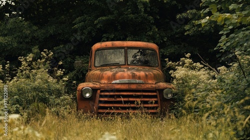 © sarun, Obraz premium An old, rusty truck abandoned in a field, overgrown with weeds and surrounded by nature.