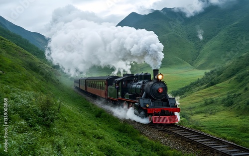 © ABC IMAGE, Obraz premium An old steam locomotive with a vintage black and red body, puffing thick white smoke while traveling through a lush green valley.
