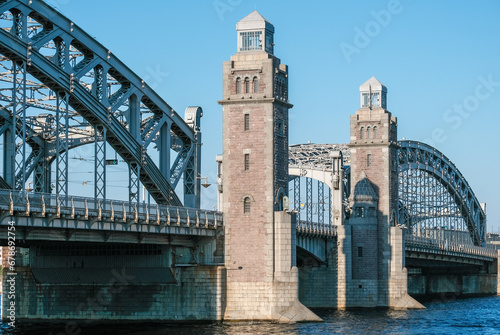© Сергей Лаврищев, Fototapeta premium An old stone bridge over the river with iron arches.