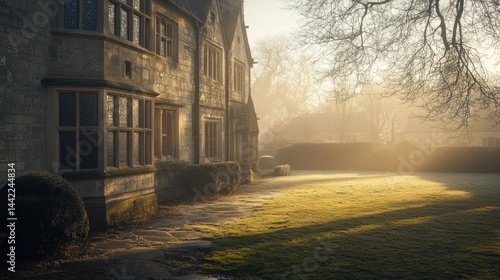 Fototapeta premium An old stone house basks in the morning sunlight with fog