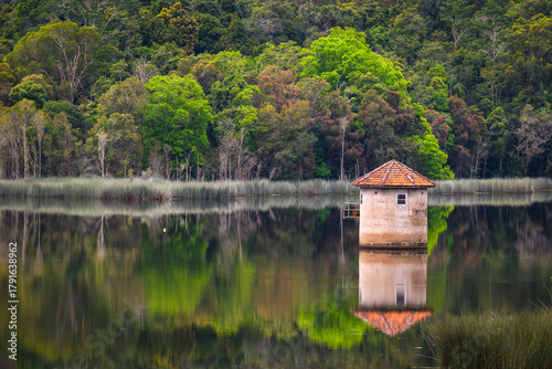 © Natsky, Obraz premium An old stone water tower in the middle of a dam - horizontal