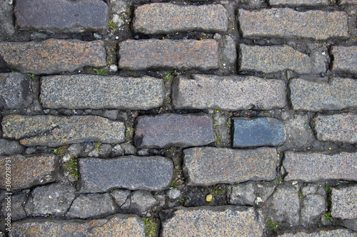 Fototapeta premium An old stoneblock pavement cobbled with rectangular granite blocks with grass between blocks