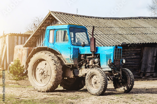 © aapsky, Obraz premium An old tractor in the countryside amid barns and sheds.