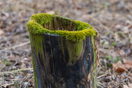 Obraz premium An old tree stump in the forest is covered with green moss.