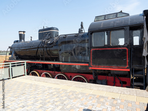 © Sergey, Obraz premium An old vintage black steam locomotive is standing on the platform. Old technologies