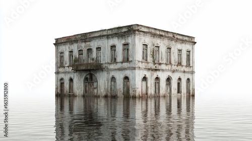 © nur khayati w, Naklejka premium An old, waterlogged building in a flood, isolated on white