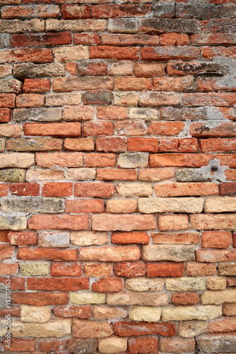 © Scarlet_Mari, Obraz premium An old weathered, clay brick wall with visible texture, imperfections, weathering etc