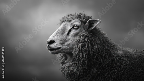 Obraz premium An old, wise sheep with a slightly graying wool coat, staring thoughtfully...