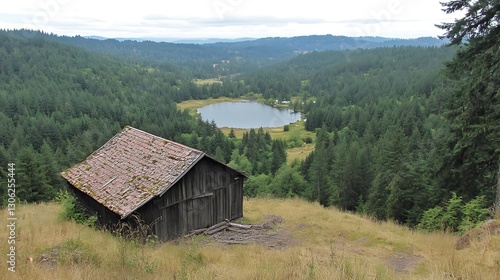 © sosis, Obraz premium An Old Wooden Barn Overlooking A Lush Forest Lake Landscape