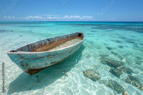 Naklejka premium An old wooden boat gently rests on crystal-clear shallow waters with a...