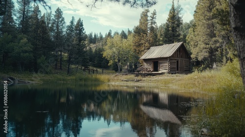 Fototapeta premium An old wooden cabin in the woods, surrounded by pine trees and a serene lake.