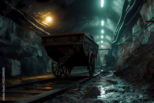 Naklejka premium An old wooden cart running through a mining tunnel, illuminated by soft light...