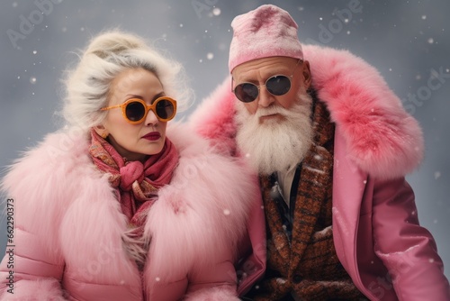 Obraz premium An older couple embraces the eccentricity of winter, donning pink fur coats and funky sunglasses as they pose confidently in the snowy outdoors