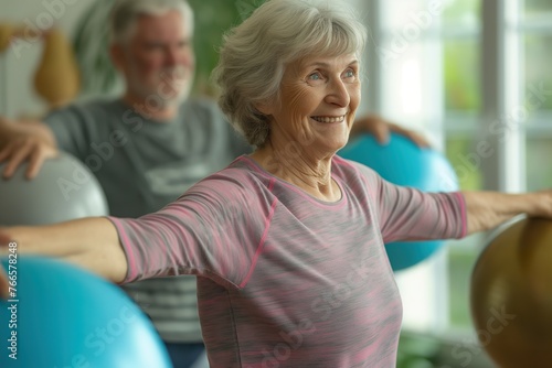 Obraz premium An older woman is engaged in exercise, while a man can be seen in the...