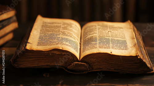 © The Stock Photo Girl, Obraz premium An open antique book with yellowed pages resting on a wooden surface.