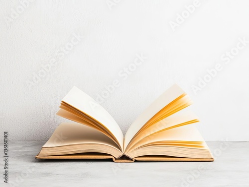 © InkCrafts, Fototapeta premium An open blank book on a clean surface ready for notes or sketches.