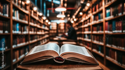 Fototapeta premium An open book in a cozy library, with shelves of books and a person reading in the background.