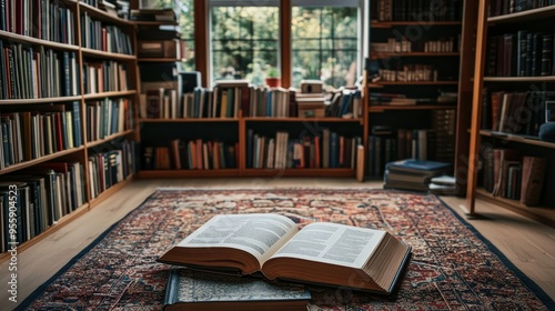 Fototapeta premium An open book lies on a patterned rug in the center of a room surrounded by bookshelves, symbolizing knowledge, education, reading, and the pursuit of learning. The abundance of books suggests a well-s