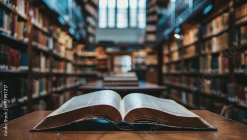 Fototapeta premium An open book lies on a table in a library with a blurred background of...