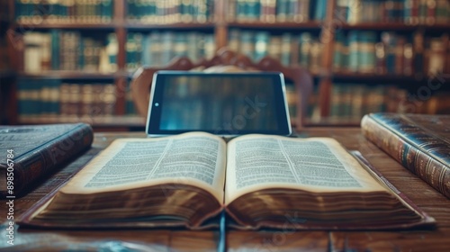 Fototapeta premium An open book on a table with a tablet surrounded by more books, set in a traditional library ambiance, blending old and new reading materials for study or reading.