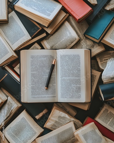 Obraz premium An open book surrounded by various closed books and a pen, symbolizing study...