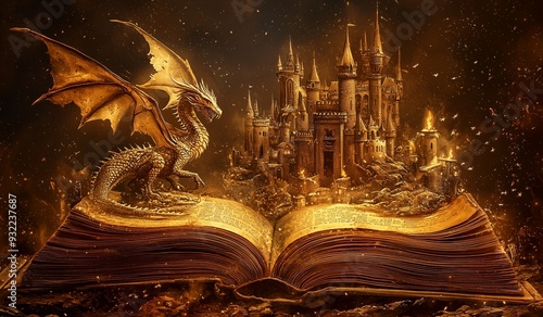 © Ace64 Studio, Naklejka premium An open book with an intricate scene of fantasy and adventure coming to life featuring dragon and medieval castles on the pages. The background is a dark brown.