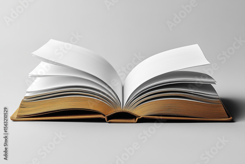 Fototapeta premium An open book with blank pages against a white background.