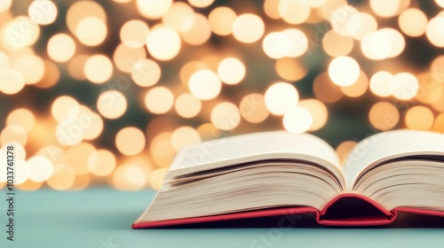 © Shisanupong, Obraz premium An open book with visible pages, set against a background of golden bokeh lights. The soft, dreamy atmosphere highlights warmth and inspiration.