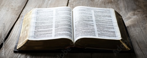 Fototapeta premium An open book with visible text on wooden surface, suggesting study or reflection.