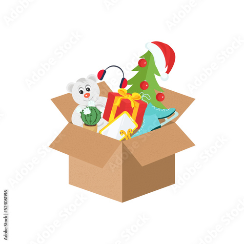 Obraz premium An open box with New Year's gifts. Christmas tree, bear, phone. Vector...