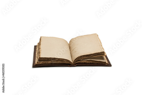 © Nikolay, Obraz premium An open empty old notebook isolated on a white background.