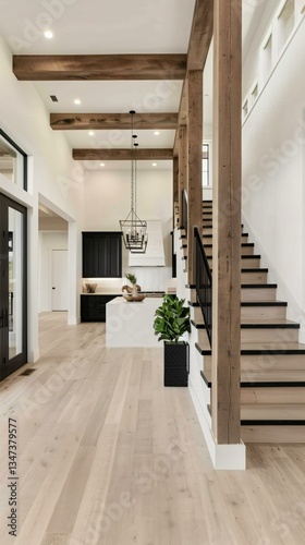 © Jack, Obraz premium An open-riser oak staircase with sleek black accents, blending modern and rustic styles in a luxury home.