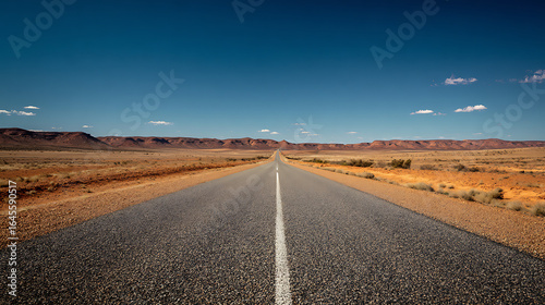 Fototapeta premium An open road leading towards a desert horizon under a clear, blue sky (1)