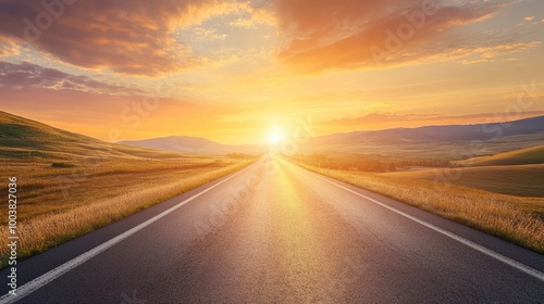Naklejka premium An open road stretching infinitely into the sunset, surrounded by rolling...