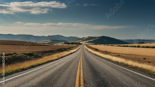 Fototapeta premium An open rural road stretches into the horizon under a clear sky, perfect for...