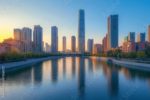 © MUdaylah, Naklejka premium An open view of the river and modern urban architecture skyline panorama in Tianjin China with generative ai