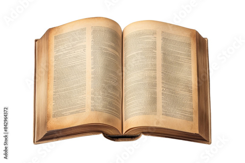 © Rattanathip, Fototapeta premium An open vintage book with yellowed pages, displaying text on both sides, evoking a sense of history and nostalgia.